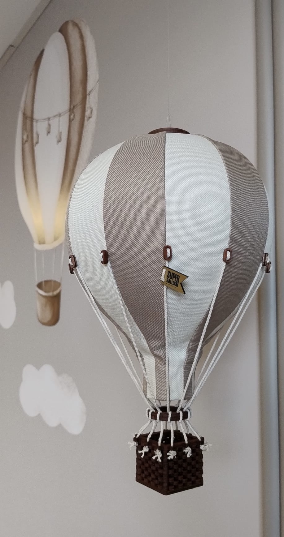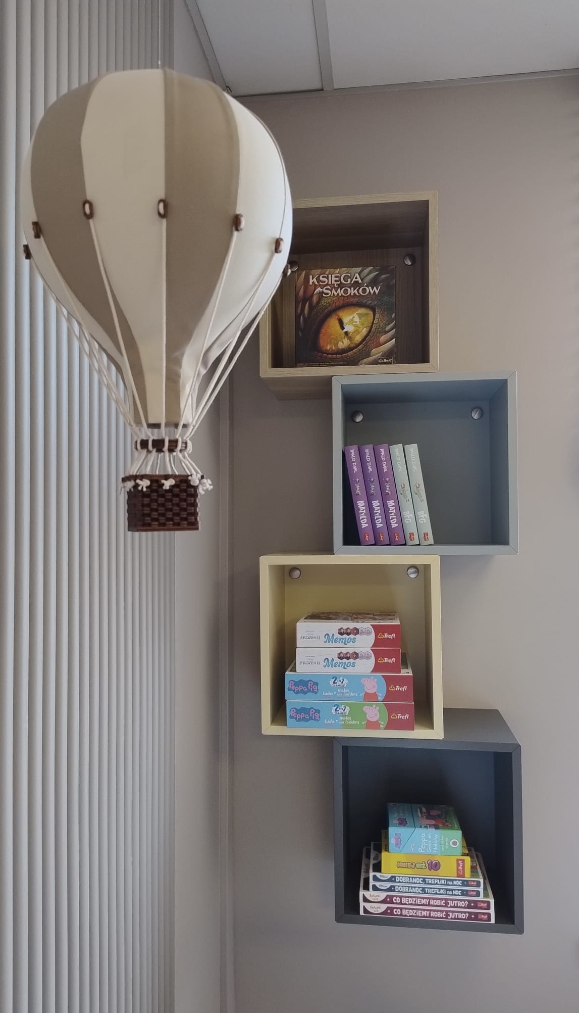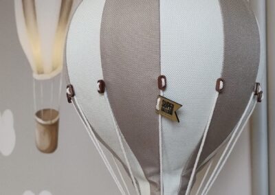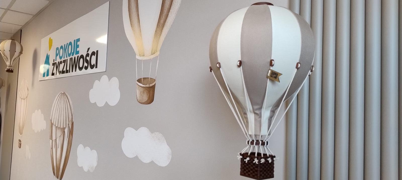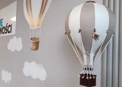 Ściany pomalowano i przyozdobiono dekoracyjnymi panelami ryflowanymi, wiszącymi balonami, naklejkami dużych balonów i chmur oraz drewnianymi dekoracjami.