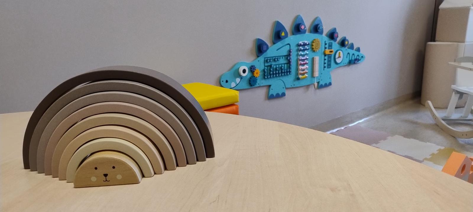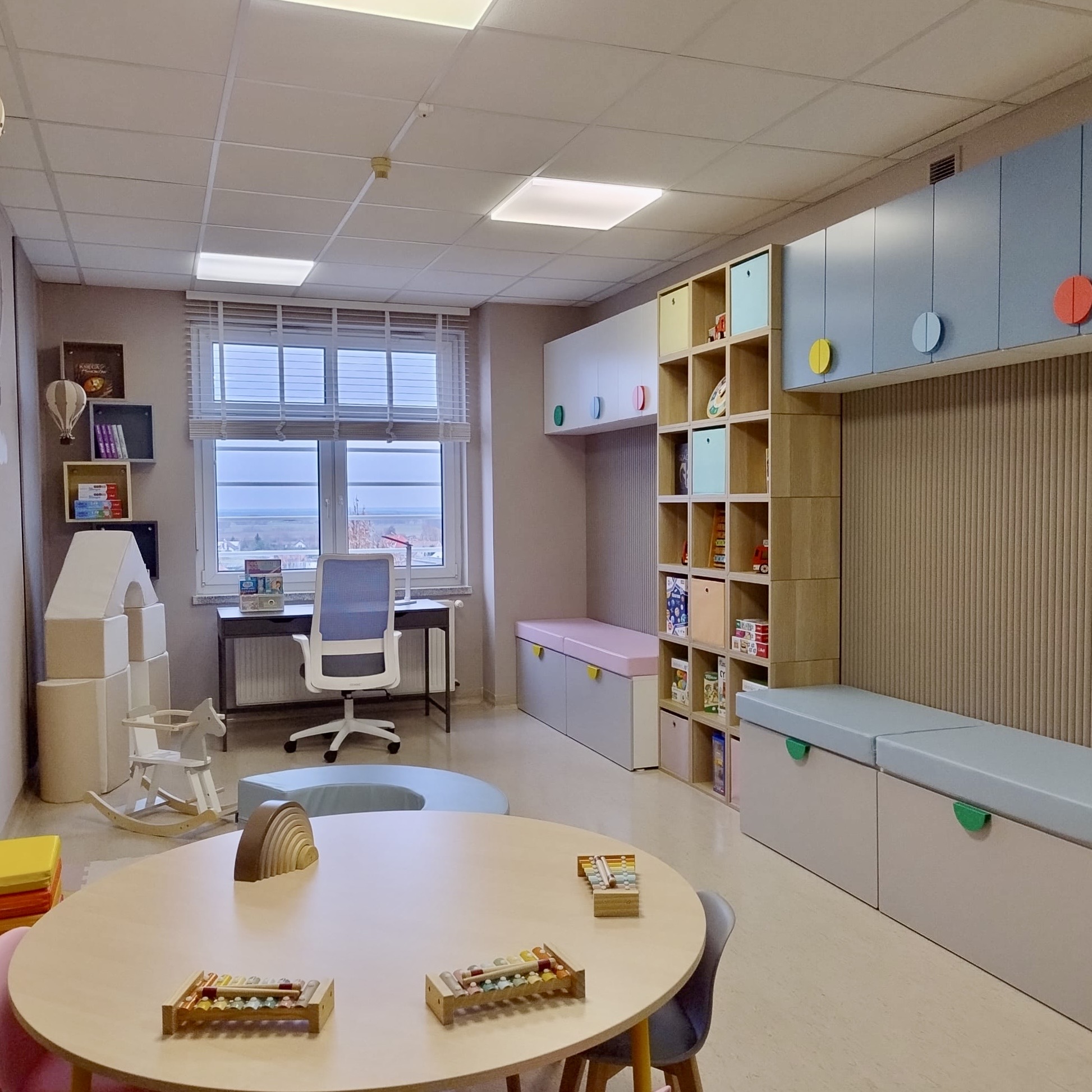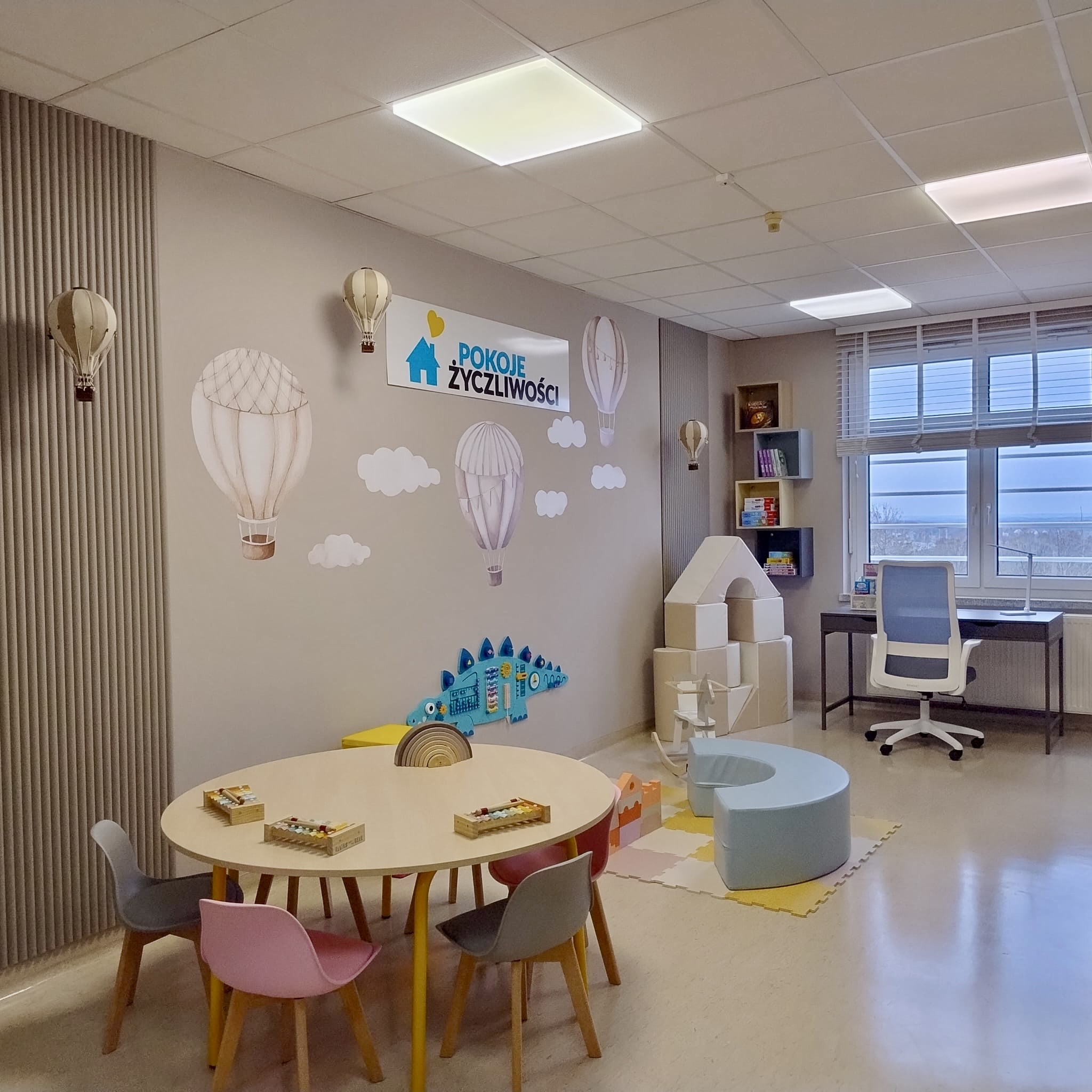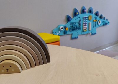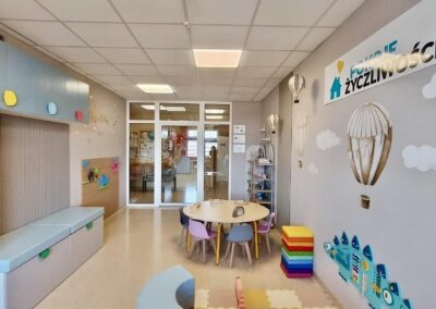 Wydzielono kącik dla najmłodszych dzieci z matami, kolorowymi siedziskami, tablicą manipulacyjną w kształcie dinozaura, zestawem małych i dużych klocków piankowych i koniem bujanym. Pokój zyskał stół do zabawy i rysowania oraz biurko dla starszych dzieci.