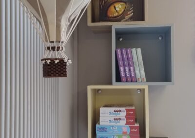 Wyposażenie pokoju zostało zaprojektowane według autorskiego projektu – wykonano wnękę na książki i siedzisko dla najmłodszych z materacem i poduszkami. Wydzielono przytulny kącik z wygodnymi fotelami i pufami oraz stolikiem kawowym, przy którym ustawiono łóżeczko turystyczne dla niemowlaków. Całe wnętrze udekorowano tekstyliami nadając przytulności pomieszczeniu.