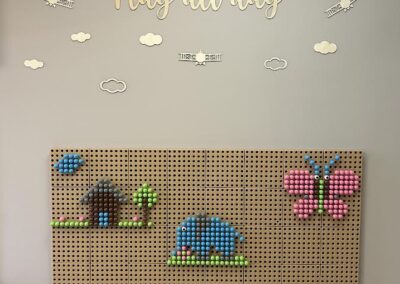 Powstała również ściana z okrągłymi półkami – miejsce do leżakowania. Ściany zostały pomalowane i przyozdobione naklejkami ściennymi. Wyposażenie pokoju – zaprojektowane według autorskiego projektu, wykonane przez stolarza meble oraz zabawki charakteryzowały się wysokim poziomem ergonomiczności. Zainwestowano w wyposażenie pokoju tak jak i w sprzęt audiowizualny, gry edukacyjne oraz książki. Zamontowane zostały także dystansowe tabliczki sponsorskie.