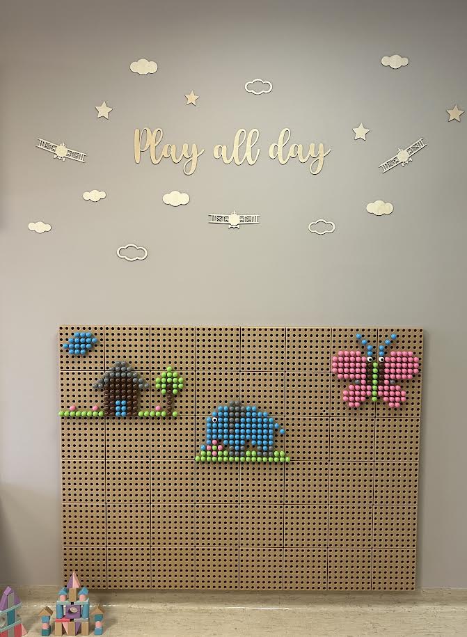 Usunięto marmolit ze ścian, a ściany pomalowano i przyozdobiono koszami na zabawki, drewnianą mapą świata 3D, tablicą manualną i tablicami do rysowania.