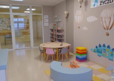 Sala została wyposażona w wygodne pufy i materace, wiszące półki na zabawki, stoły do zabawy i do rysowania, zestawy tablic manipulacyjnych, zabawki i gry edukacyjne, książki oraz przybory szkolne.